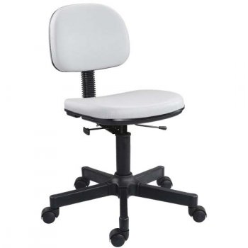 Cadeira digitador ergonômica revestida em couro sintético ou tecido sobre espumas injetadas de 4 cm de espessura. A base tem regulagem de altura a gás, pés com capa protetora, regulagem de distância do encosto .